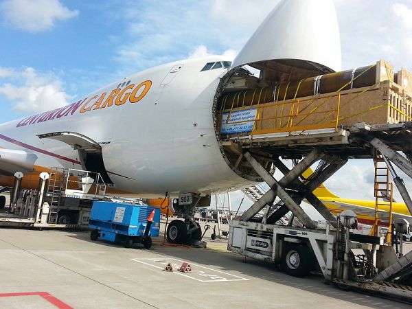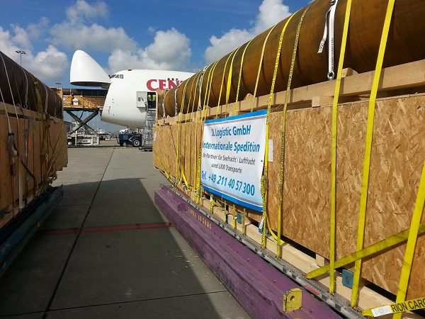 Die Sendung musste in einem Lot befördert werden, daher kam nur ein Charter in Frage. Nachdem wir die exakten Maße für die Verpackung, die eine Verladung durch die Nase einer Boeing 747-400 möglich machen, dem Kunden aufgegeben hatten, wurden die Rohre in Verschläge und auf Transportböden gestaut und in Amsterdam angeliefert.
